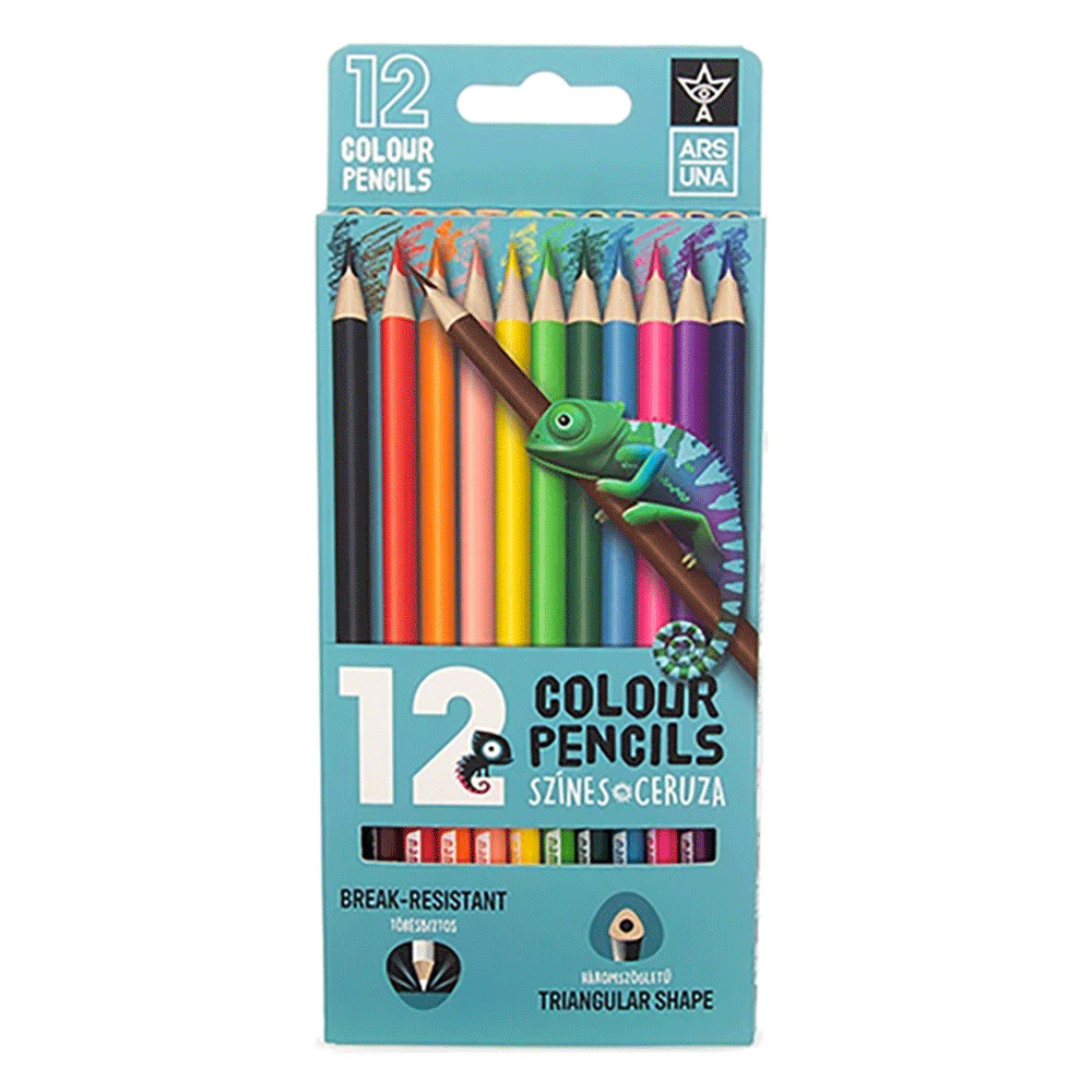 Háromszögletű,ergonomikus kialakítású színes ceruza, törésálló béllel. 12 db-os kiszerelésben, élénk színekben. Könnyen hegyezhető. A ceruzatest és a ceruzahegy színe megegyezik. Papír dobozban. EURO lyukkal ellátva.