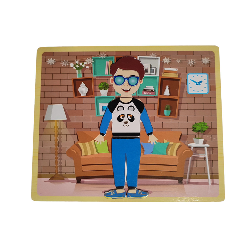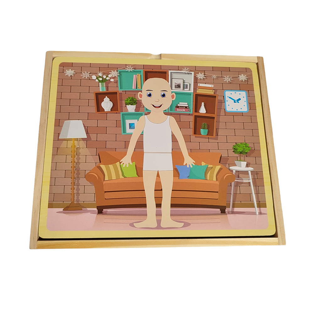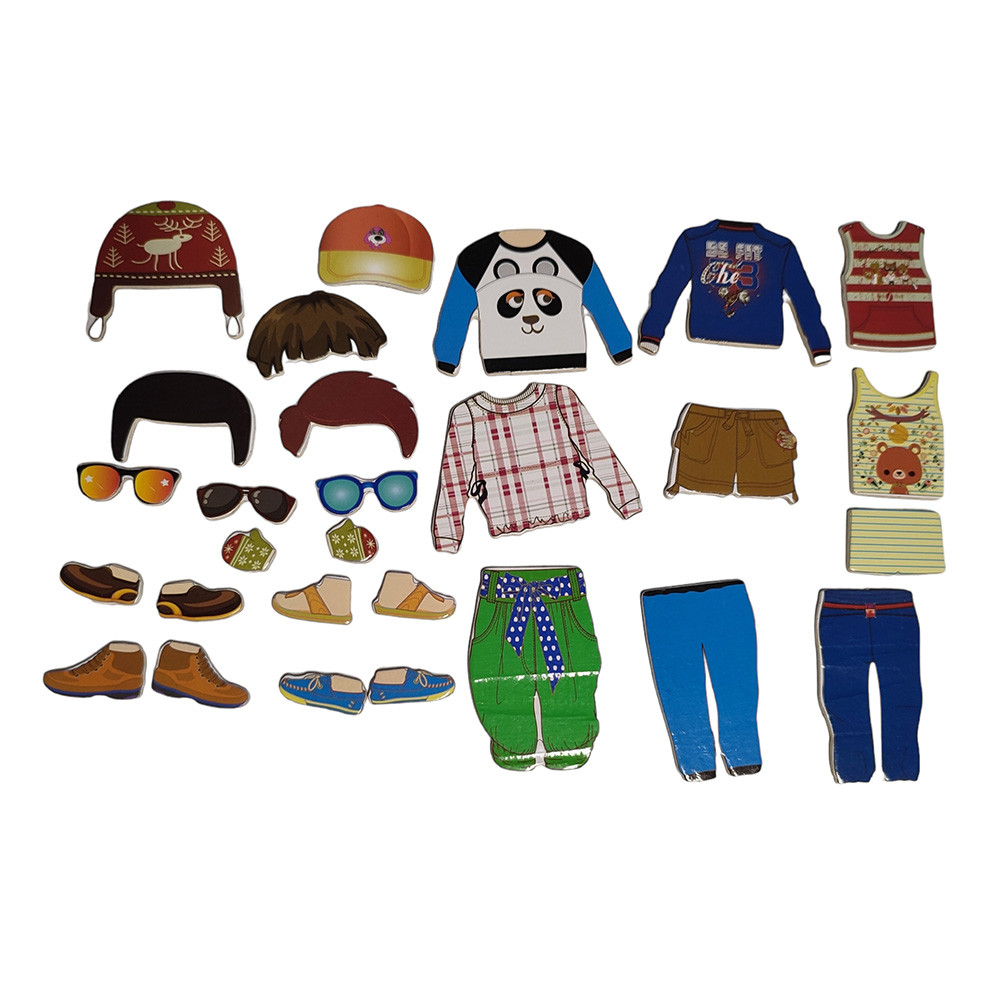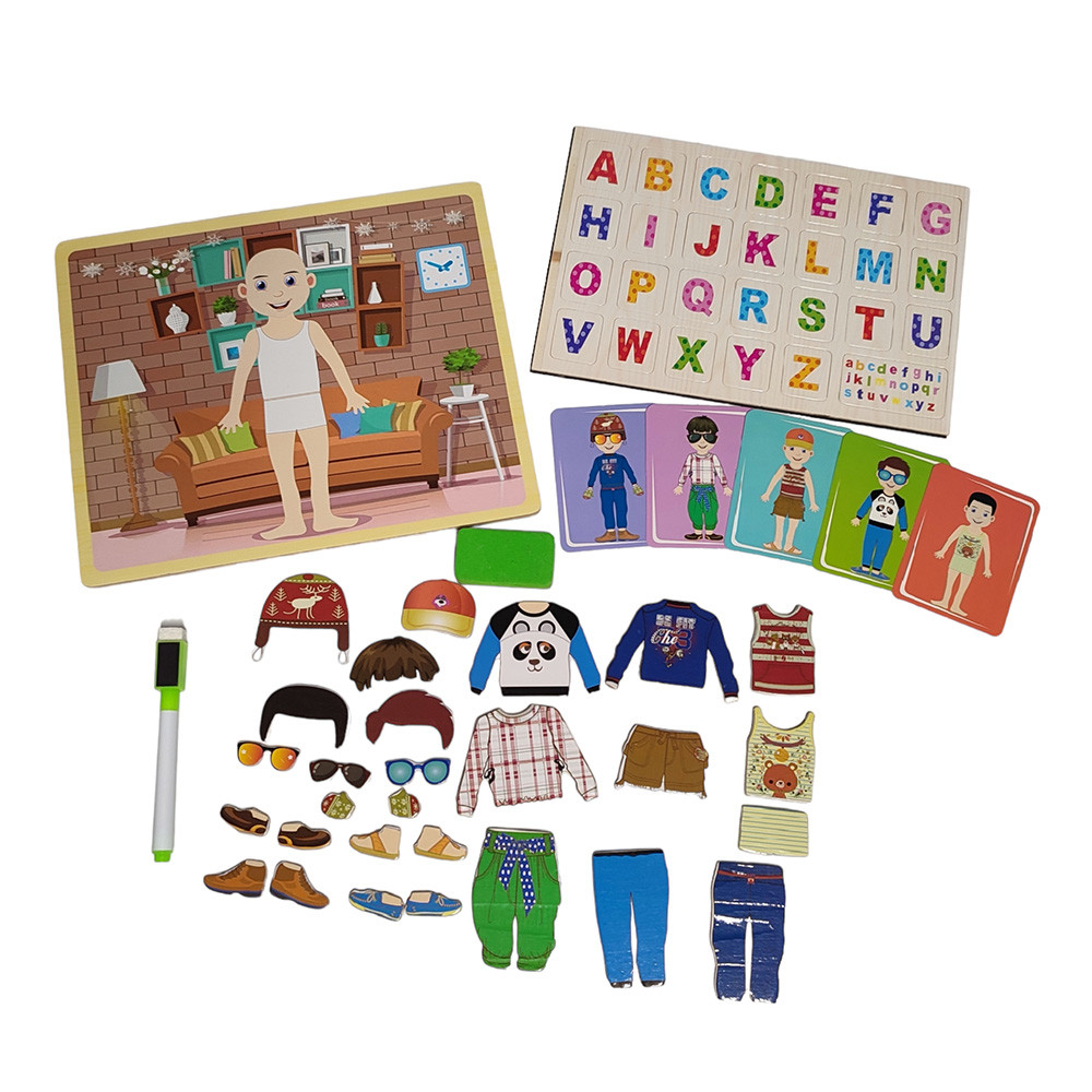 A játék táblája 2 oldalas, az egyik oldalára egy szobában álló gyerkőc van festve kis trikóban és bugyiban. A gyerekek dolga lesz felöltöztetni őt. A kiegészítők között találnak különböző hosszúságú hajakat, amivel meghatározhatják, hogy kislány vagy kisfiú lesz, valamint rengeteg egyéb kiegészítőt is Pl.: cipőket, szemüvegeket, ruhákat, kalapokat, sapkákat.. stb..amik mágnessel vannak ellátva így könnyedén felhelyezhetőek a táblára. A készletben található még 5 db kártya is ötlet adónak a kicsiknek, vagy épp feladat jellegű felhasználásra.