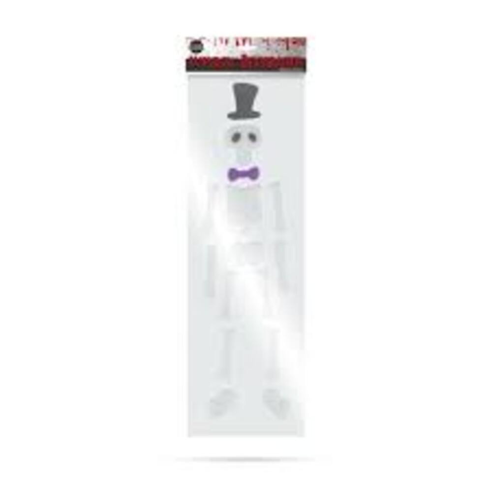 Vidám Halloween dekoráció gél matrica formában. A cilinderes, csokornyakkendős csontváz könnyen felhelyezhető ablakra vagy sima felületre, és remek hangulatot teremt a bulikhoz vagy otthoni díszítéshez.